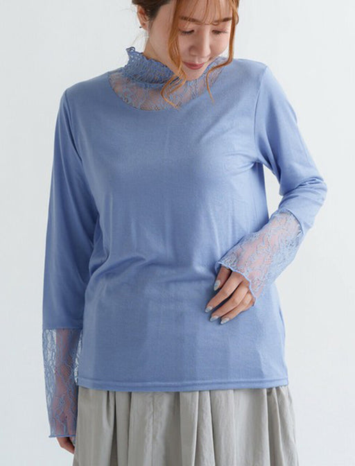 襟部分のシャーリングが特徴的なハイネックインナー。<br>襟と袖口には同色のレースをあしらい、上品なアクセントをプラス。<br>ギャザーネックはほどよい透け感があり、女性らしい印象に仕上げています。