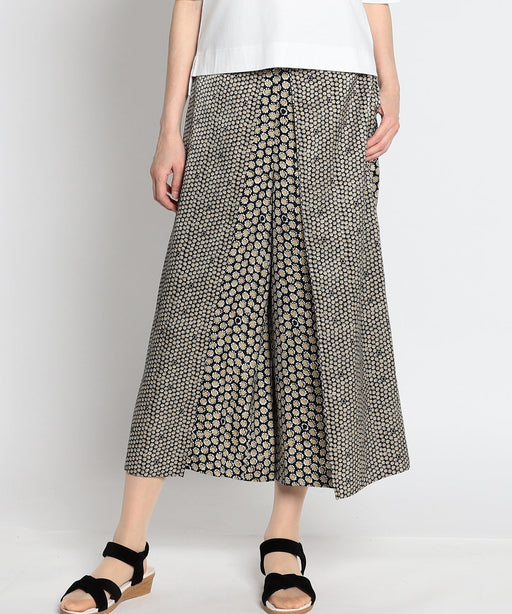 シンプルなモノトーンカラーがシックで華やかな印象のロングスカート。 大柄のプリントがゆったりと揺れるプリーツ仕上げで、上品な女性らしさをプラス。 Aラインシルエットで広がりすぎず、バランス良く着こなせます。