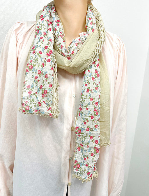 メッシュ素材とプリントデザインを組み合わせたストール。<br>無地部分とプリント部分のコントラストが魅力的で、シンプルながらもおしゃれな印象を与えます。<br>軽やかな素材感で、季節の変わり目にぴったりなアイテムです。