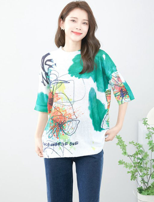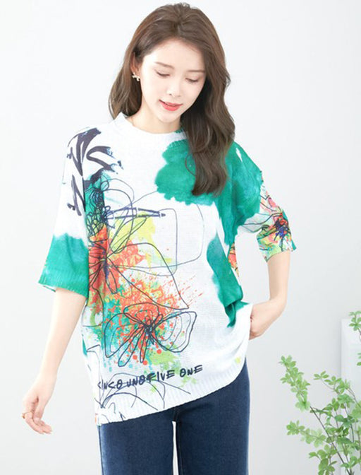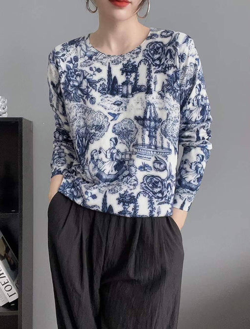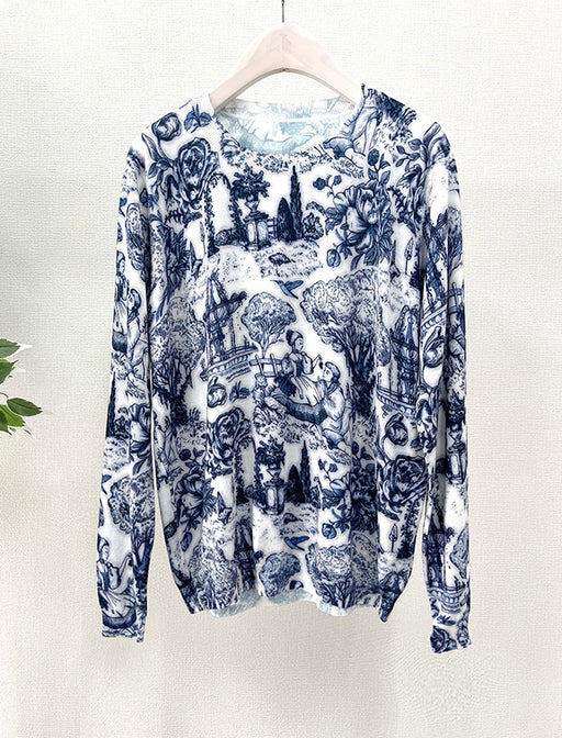 水彩画のような柔らかなタッチで描かれたプリントが特徴的なVネックニット。<br>首元をすっきり見せるVネックデザインと流れるような柄が相まって、軽やかな印象に仕上げました。<br>一枚で主役級の存在感を放つ、大人のエレガンスを楽しめるアイテムです。