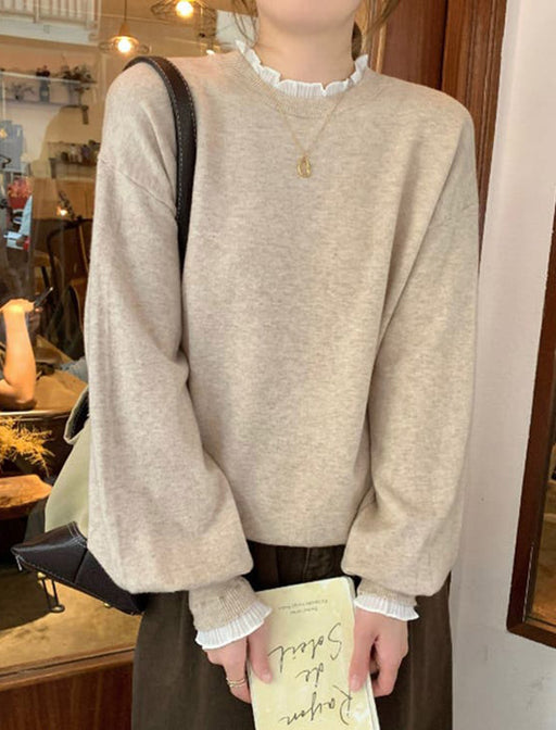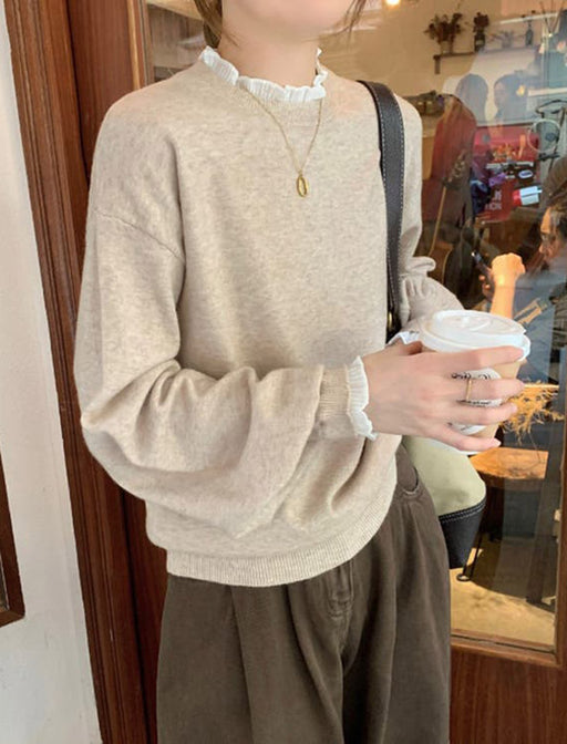 いつものスタイルに華やぎをプラス。一枚で主役級のフェミニンニット。 顔周りと手元を美しく彩るディテールにこだわった、大人フェミニンなニットプルオーバー。 上品なニット生地に、繊細なレースをあしらい、一枚で着映えするデザインに仕上げました。