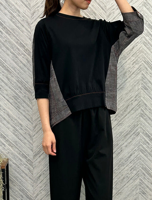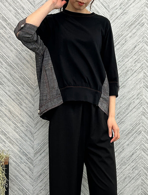 モードな雰囲気をプラスする、異素材バイカラーデザイン。 前後で異なる素材感と配色で、トレンド感を高めつつ立体的なシルエットを実現します。 ロールアップ仕様のスリーブで二の腕周りをさりげなくカバーしつつ、軽やかな印象をプラスします。
