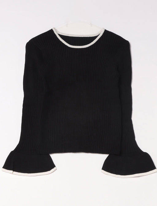 ひらひらとした布帛の切り替えが特徴的なニットプルオーバー。<br>袖と裾がひらひらと広がり、九分袖から手首が覗くデザインが洗練された印象を与えます。<br>一枚で着映えるトップスなので、いつものボトムにプラスするだけで旬の着こなしが叶います。