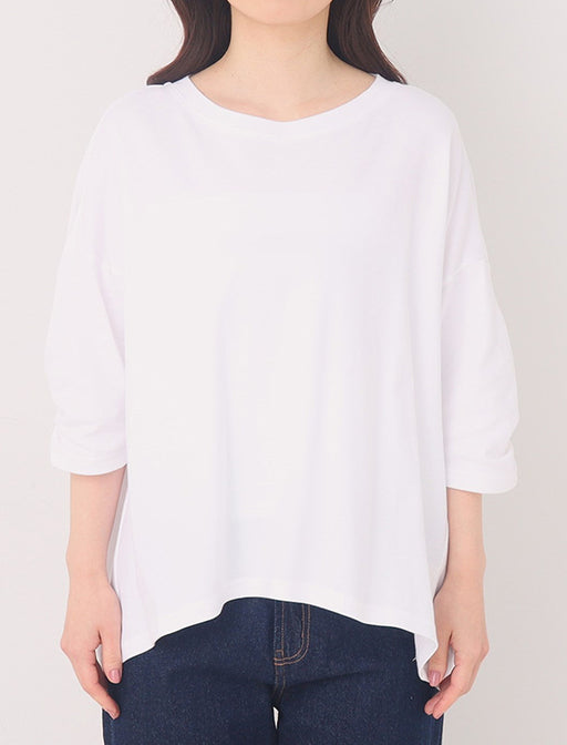GOTS認証のオーガニックコットンを使用した、肌ざわりやさしい七分袖プルオーバー。<br>バックに施されたテープとギャザーが立体感を生み出し、シンプルながらも印象的な後ろ姿を演出します。<br>ナチュラルでリラックス感のある着心地と、美しいシルエットを両立した一枚です。