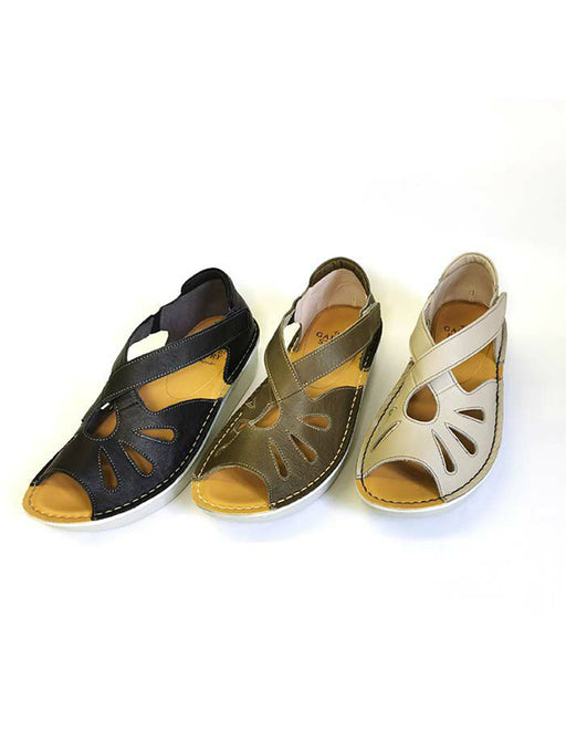 華やかな花柄箔プリントが目を惹く4Eワイズの前あきサンダル。<br>サイドベルトはゴム仕様で、足にしっかりフィット。<br>ふんわりクッション入り中敷で、快適な履き心地が続きます。