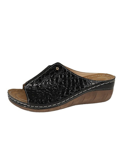 華やかな花柄箔プリントが目を惹く4Eワイズの前あきサンダル。<br>サイドベルトはゴム仕様で、足にしっかりフィット。<br>ふんわりクッション入り中敷で、快適な履き心地が続きます。