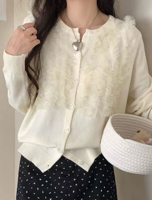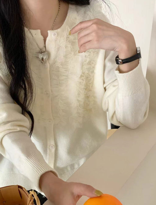 繊細なレース切替が女性らしさを引き立てる上品カーディガン。 甘さ控えめのデザインで、大人のきれいめスタイルにぴったり。 羽織るだけで華やぎを添えてくれる一枚です。