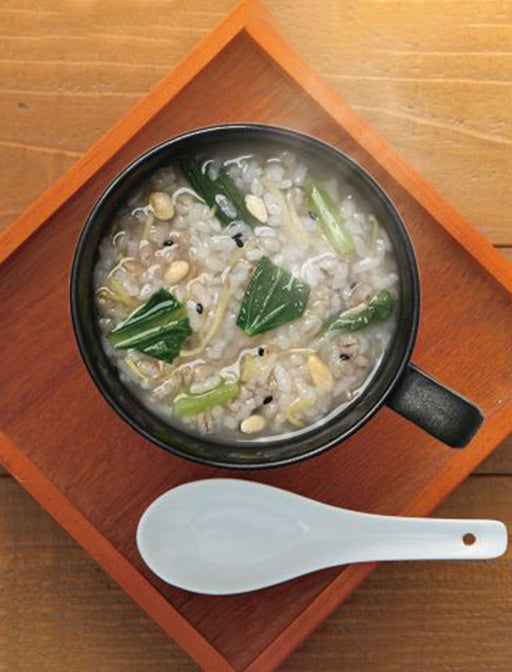 食物繊維豊富なもち麦を使用し、独自製法でふっくら炊き上げたおじや。<br>具材には高知県産の千切り生姜と国産小松菜を厳選し、アクセントに松の実をプラス。<br>焼津産鰹節粉末と北海道産利尻昆布出汁に、隠し味のチキンの旨みを加えた奥深い和風の味わい。<br>フ...