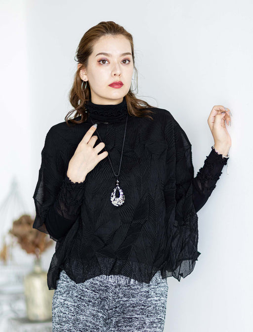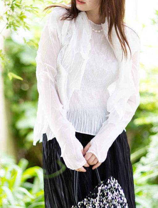 女性らしさが香る華やかなショールカラーを大胆に彩る、立体的で美しいプリーツボレロ。 シアー感と3Dなプリーツの表面変化をお楽しみいただける贅沢なデザイン。 後ろの着丈はやや長めに仕上げているので、さらっと羽織るだけでバランス良くスタイルアップも叶えてくれます。