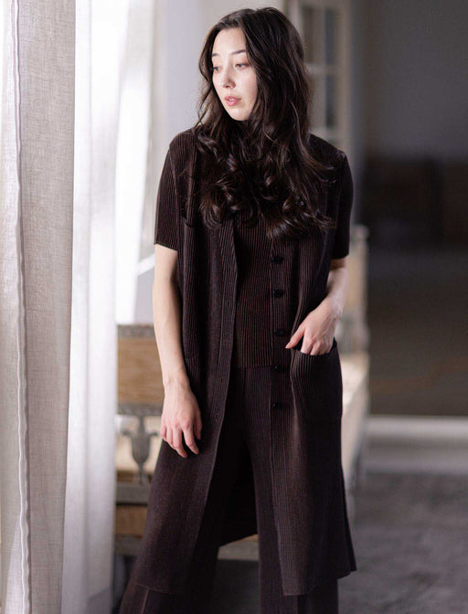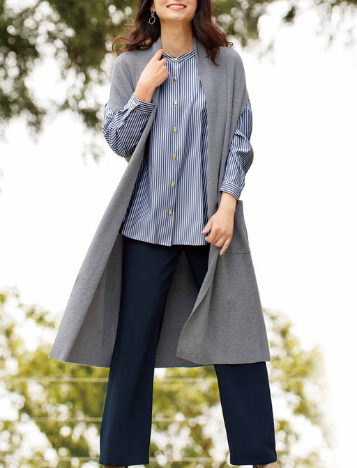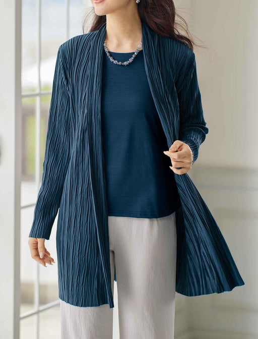 プリーツ調の表面感が流麗なアンサンブル。 繊細でランダムな畝が表現されたジャージーカーディガンは、ロングシルエットにすらっと流れる縦ラインが印象的。 インナーは着回しにも便利な無地の七分袖カットソープルオーバー。