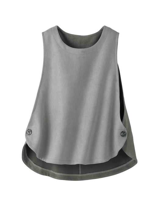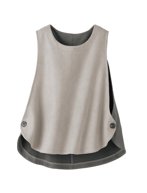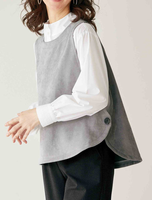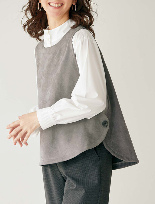 前後の配色が可愛いスエードタッチベスト。 前後で異なるカラートーンがさり気なくおしゃれ。 やわらかな風合いのカットソーを使い、両脇の飾りボタンがポイントのゆったりフレアーなシルエット。