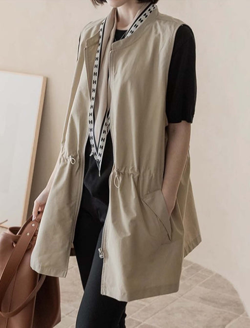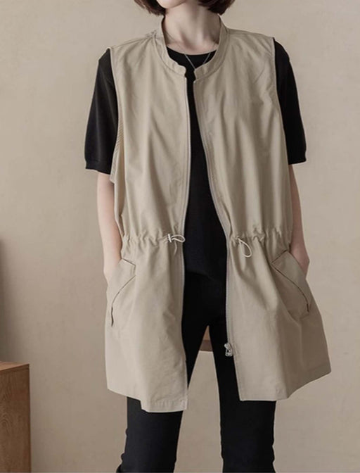 レイヤードの必需品とも言える、軽やかなロング丈ベスト。 ウエスト部分のドローストリングでシルエットの調整が可能、スタイルアップにも期待できます。 大人のカジュアルスタイルに、ひとつプラスするだけで洗練された印象に。