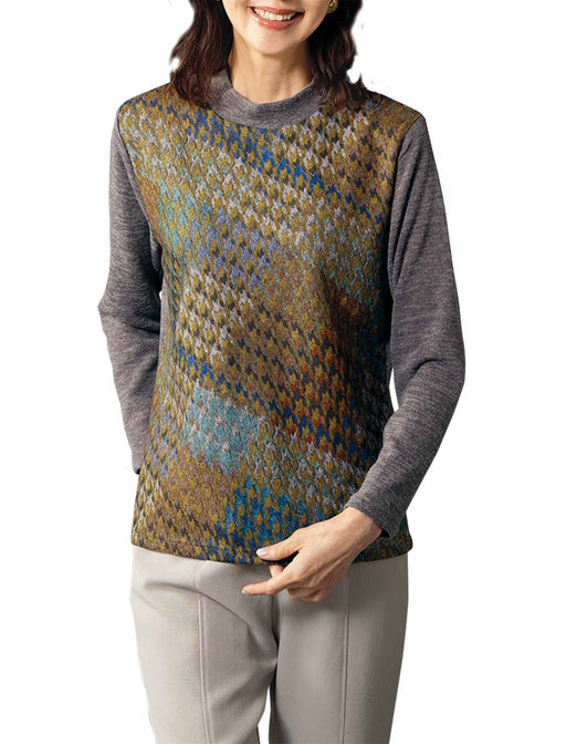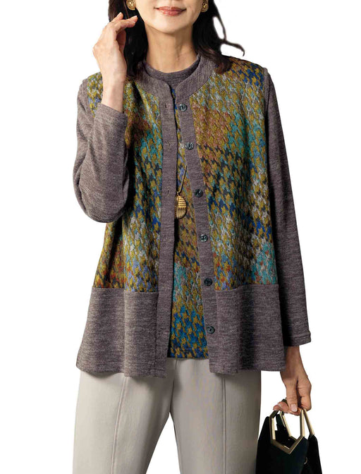 ニュアンスカラーの柄使いが、秋の優雅な装いを演出。 鮮やかなプリント柄を前身頃に切り替え、腰部分に無地を効かせた上品アンサンブル。 ベストと同柄プルオーバーを組み合わせた大人可愛いデザインは、 季節の変わり目も心地よく過ごせる人気アイテムです。