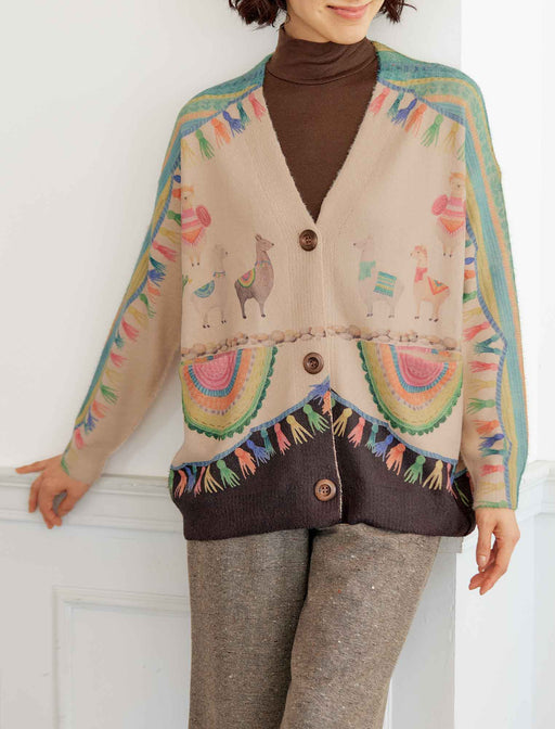 色えんぴつタッチの彩りがポップで可愛い。 動物たちの表情まで可愛く描かれたパネルプリントのニットカーディガン。 なめらかな肌ざわりで、モチっとソフトな風合いだから心地よく羽織れます。