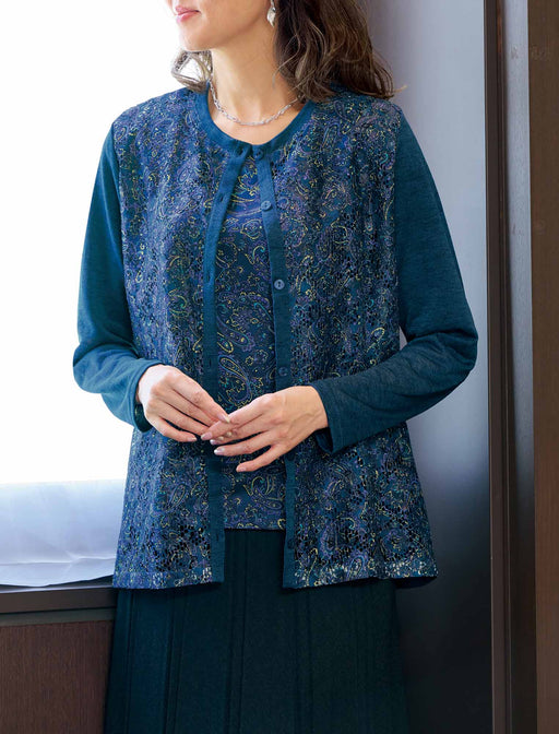 品の良い華やぎと着やすさを兼ね備えた、豪華なペイズリー柄をあしらったアンサンブル。 カーディガンの前身プリント部分はレースを使い、プルオーバーのプリント部分は布帛でブラウス感覚仕上げ。 袖と後身頃はシワになりにくいカットソー素材で着心地も◎。