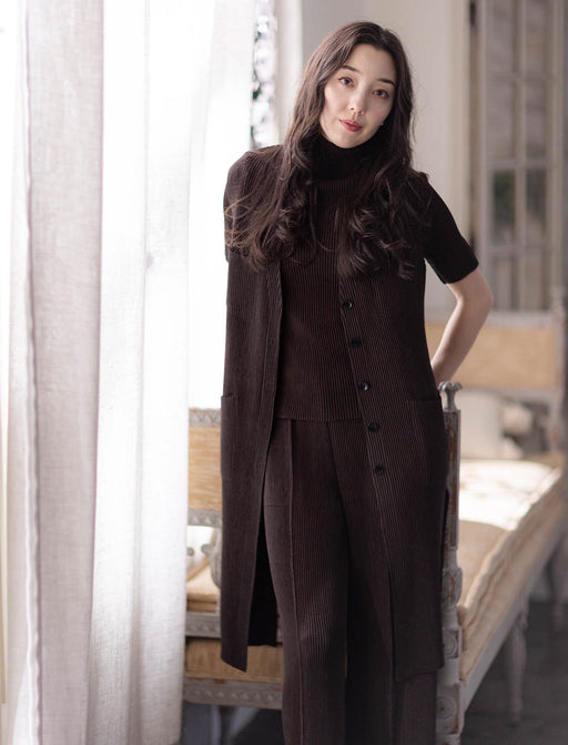 気分次第で着こなしが変わる、着回し力抜群のプリーツレイヤードアイテム。 ブラウスやTシャツの上に重ねるだけで、縦のラインが強調され、スタイルアップ効果抜群の旬なレイヤードスタイルが完成。 お揃いになるセンタープレスパンツを合わせて、スタイリッシュに着こなせるハンサムコーデもおすすめ◎