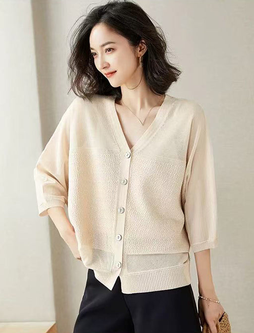 シースルー素材で軽やかな着心地が魅力のサマーカーディガン。<br>フロント部分の切り替えデザインが、シンプルながらもさりげないアクセントに。<br>ゆったりとしたドルマンスリーブで、リラックス感とこなれ感を両立。