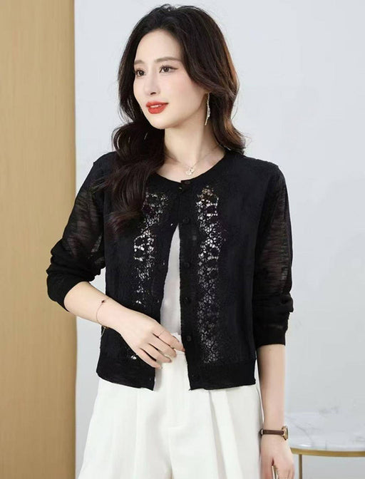 程よい透け感のレースが上品な印象を与える、ロング丈のカーディガン。<br>繊細なレース切替が女性らしさを引き立て、軽やかに羽織れる一枚です。<br>エレガントながらも日常に取り入れやすいデザインで、日除けやクーラー除けにも活躍します。