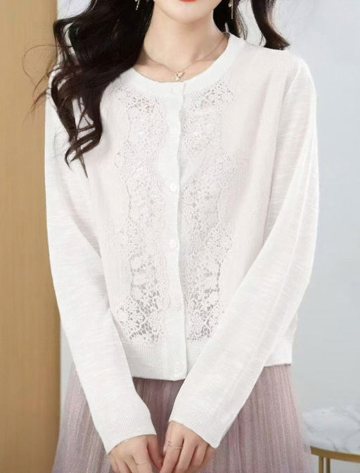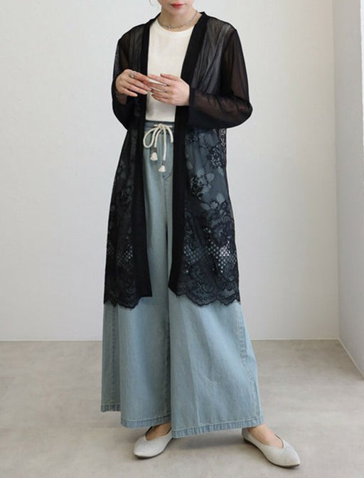 程よい透け感のレースが上品な印象を与える、ロング丈のカーディガン。<br>繊細なレース切替が女性らしさを引き立て、軽やかに羽織れる一枚です。<br>エレガントながらも日常に取り入れやすいデザインで、日除けやクーラー除けにも活躍します。
