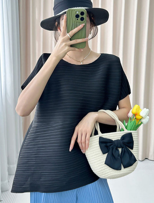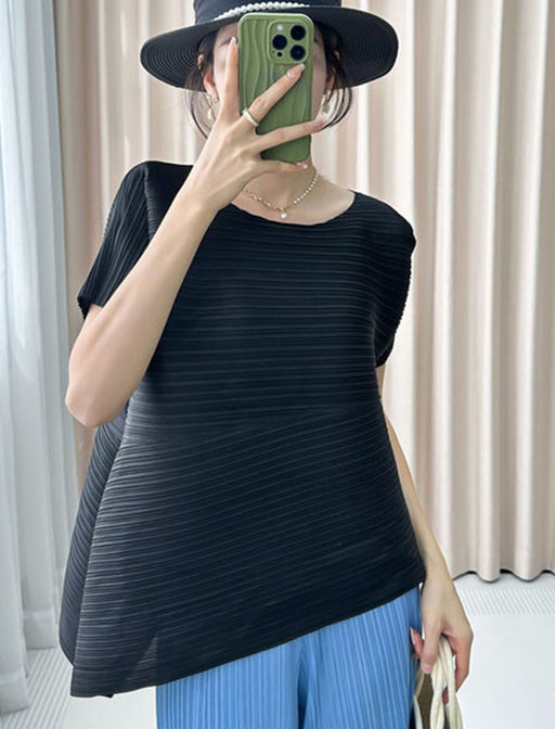 シックなプリーツとアシンメトリーに広がるシルエットで動きと表情を楽しむトップス。 ウエストの切り替えでメリハリをつけつつ、リラックス感も漂うエレガントな一枚です。 体型をカバーしてくれるので、シーンを選ばず活躍してくれる一着。