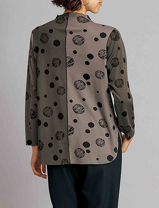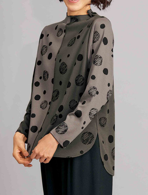 シックな大人配色で魅せるランダムドット。 濃さや大きさが異なるドット柄プリントを施したカットソープルオー バー。 動きやすいゆったりシルエットに、ラウンドさせた裾の前後差もさり気なくおしゃれ。