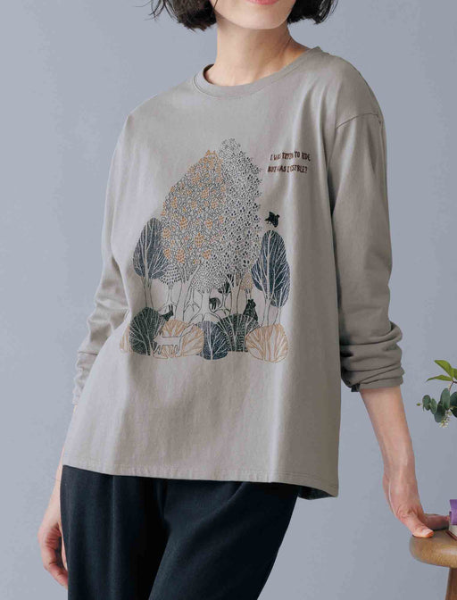 繊細なプリントとシックなカラーがおしゃれな洗練Tシャツ。 繊細なラインで描かれたプリントは、動物たちが森でかくれんぼしているかわいいデザイン。 ニュアンスカラーや刺しゅうの英文字で、上品な印象に整えました。
