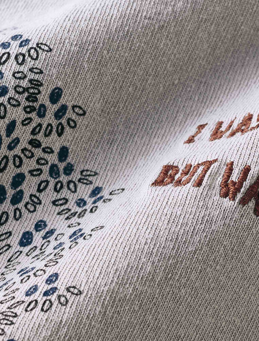 Tシャツだけで絵になるオパール加工プリント。 透け感で表現したペイズリー柄に、ロゴの線描きのプリントを重ねたプルオーバー。 肌当たりはガーゼのようにやさしく、快適な着心地です。