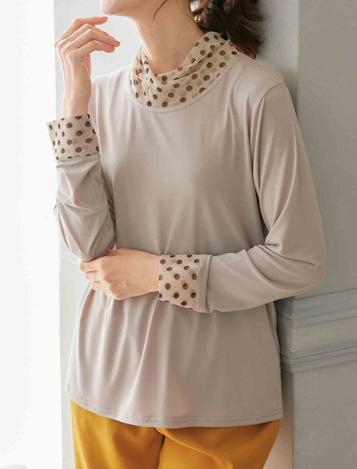 襟元と袖口に可愛らしい水玉メッシュをトッピング。 身頃は柔らかなカットソー素材で、きれいめな印象に。 異素材の切り替えデザインが、シンプルながらも洗練されたおしゃれ感を演出します。