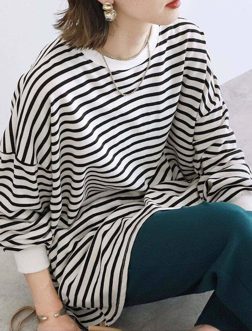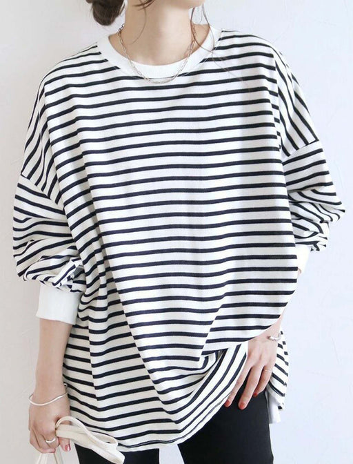 上品ボーダーで切り替えた鮮度高めの黒トップス。 マンネリがちな黒トップスを、細めのボーダーで大胆に切り替えて新鮮に。 ゆったり着られてハンサムに着映えるデザインは、六分袖の抜け感も軽やかな印象のポイントです。