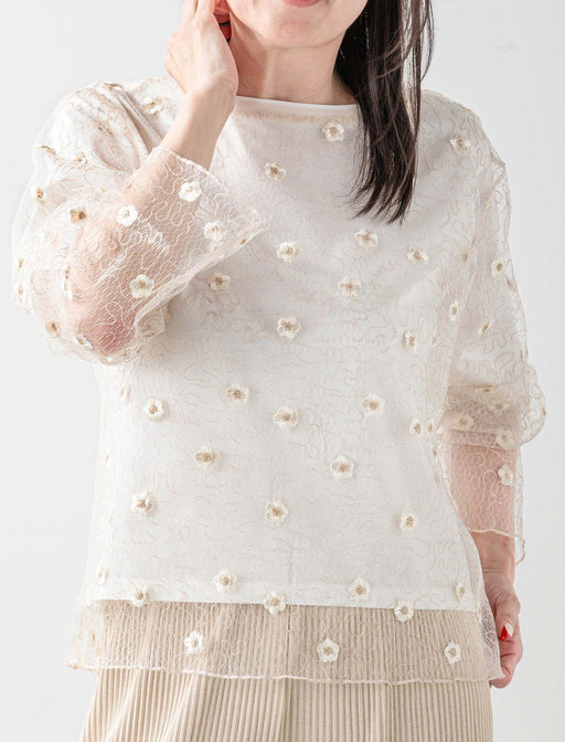 同柄のチュールを前身頃に重ねることで、華やかで立体感のあるデザインが特徴。<br>シンプルながらも奥行きのある印象を与え、コーディネートにアクセントをプラス。<br>軽やかな素材感で、季節を問わず活躍する一枚です。