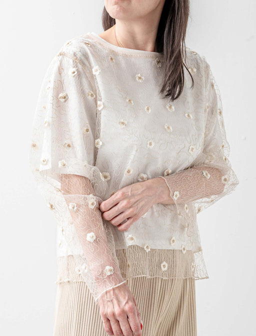 透け感と繊細な刺しゅうが魅せる、上品フェミニンなレイヤードスタイル。 総チュールの素材に小花の刺しゅうを贅沢に施し、透け感と華やかさを絶妙に両立させたデザイン。 ジャケットやカーディガンのインナーにして、ほのかな透け感で堅すぎない上品さをプラス。