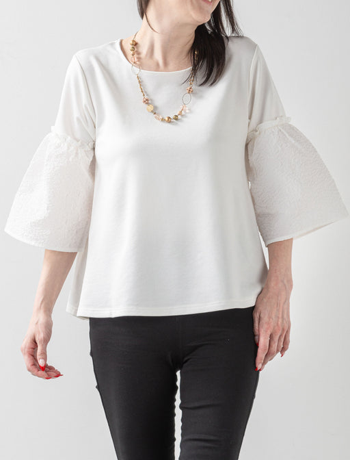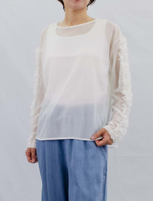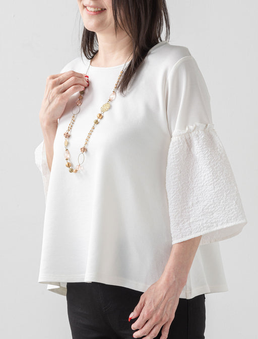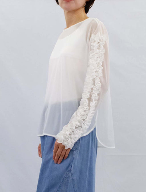 軽やかなオーガンジーを重ねた、涼しげで華やかなカットソー。<br>フレンチスリーブが腕まわりを優しくカバーし、女性らしいシルエットに。<br>ほどよい透け感と立体感で、シンプルながら印象的な一枚です。