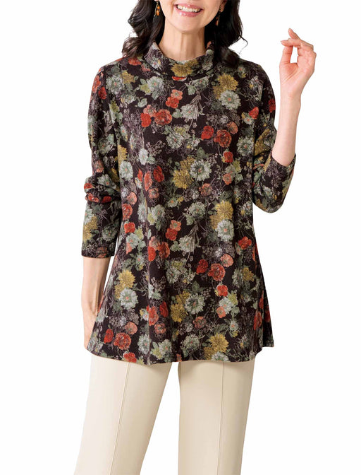鮮やかな花柄プリントが優しい印象。 体型カバーも着心地も抜群なウォーム感のあるAラインプル オーバー。 軽やかな素材が動くたびに柔らかく揺れ、女性らしい印象を演出します。
