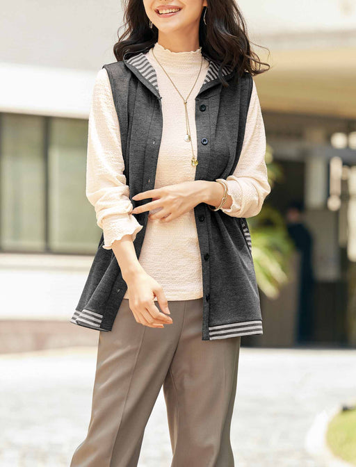 ちょっとした外出に重宝するパーカーとベストの2枚組。 軽くはおれるパーカーと、フードの大きめの襟が小顔見えを叶えてくれるベストをセットで。 どちらもポケット回りやフード・襟部分に裏面のボーダーを効かせた小粋なデザインです。
