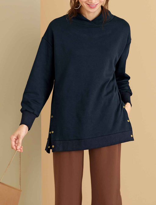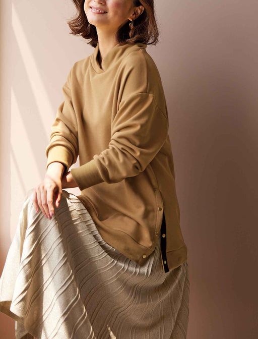 「脱、カジュアル」大人のフードレスパーカー。 首の後ろをカバーするスタンド襟や、サイドスリットの配色とゴールドカラーボタンのディティールが今っぽく新鮮。 気軽に着てもきれい見えする裏毛カットソーです。