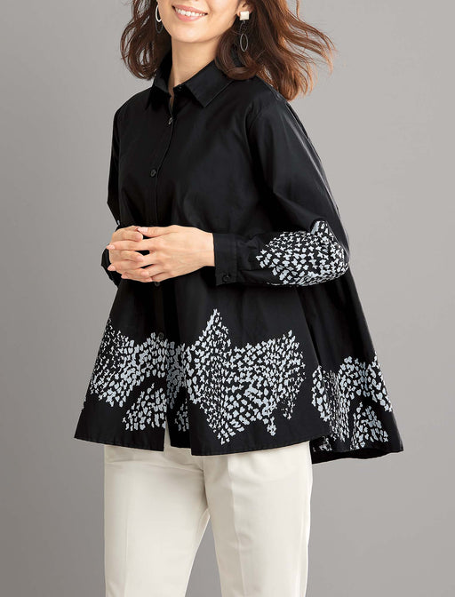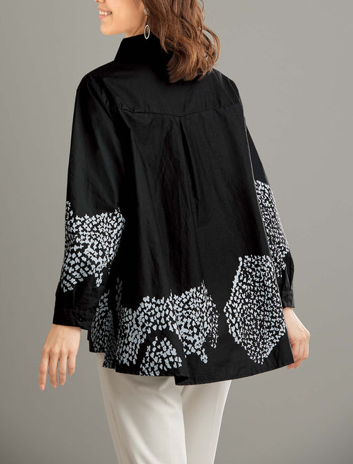 柄のコントラストが鮮やかに映えるゆったりシャツ。 くっきり浮かぶホワイトのパネルプリントが印象的。 大きめの衿がフェイスラインをシャープに演出し、裾へ広がるAラインシルエットはお腹やヒップ周りを自然にカバーしてくれます。