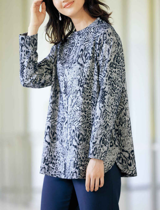 浮き立つ表情が繊細流麗なジャカード柄。 流れるような柄が洗練された雰囲気。 やわらかく伸縮性に優れたカットソープルオーバーでありながら、ブラウスのような着映え力で装いをクラスアップしてくれます。