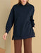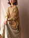 首の後ろをカバーするスタンド襟や、サイドスリットの配色とゴールドカラーボタンのディティールが今っぽく新鮮。