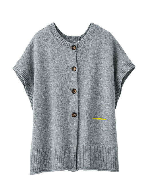 ゆったりと着られ肩先も暖かいニットベスト。 変化のある編み地とサイドスリットのボタンがアクセント。 タートルネックやシャツをレイヤードして大人カジュアルの完成。