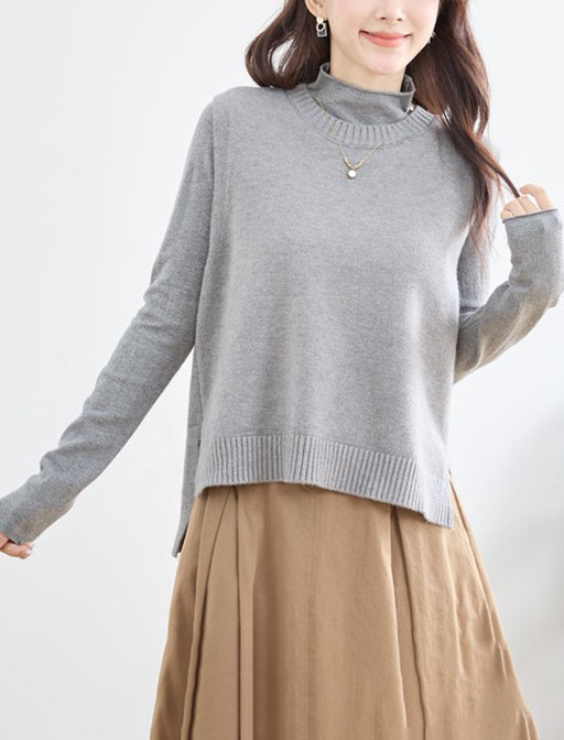 アシンメトリーな位置にダブルジップのファスナーをあしらったハイネックセーター。ハイネックが顔まわりをすっきりと見せ、上品な印象に。上下のファスナーの開け方次第で着こなしに変化をつけられ、シンプルながらも遊び心のあるデザインです。