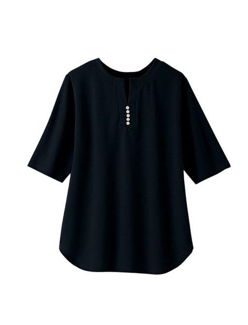 胸元をすっきりと見せるキーネックデザインに、表情を華やかにするパール調ボタンがアクセント。<br>ストレッチ性のあるカットソージョーゼット素材で、動きやすく快適な着心地です。<br>気になる二の腕をカバーする5分袖も嬉しいポイント。<br>上品さと着やすさを...