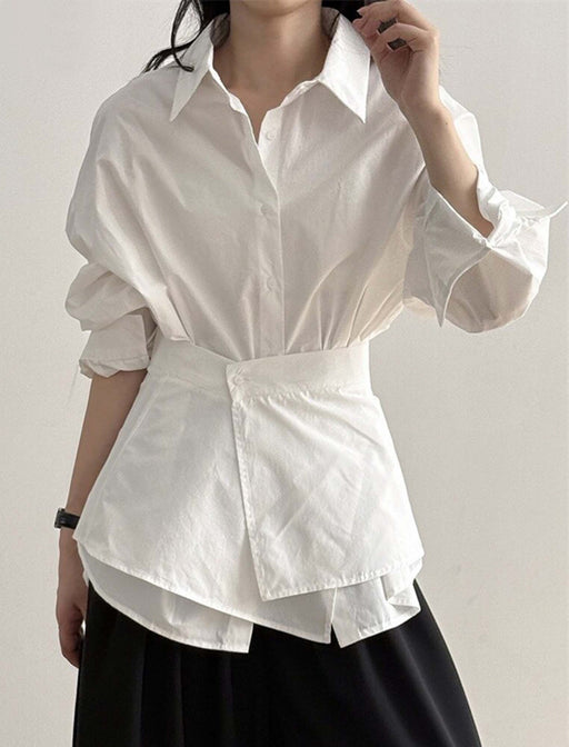 洗練されたシルエットと機能性を兼ね備えたデザインシャツブラウス。 エプロン部分は取り外し可能で、カジュアルからフェミニンまで様々なコーディネートに活躍。 肌に優しい100%綿素材は、一日中快適に着用いただけます。