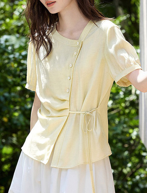 カシュクール風のフロントデザインが女性らしい抜け感を演出するブラウス。<br>ウエストのサイドリボンがさりげないアクセントになり、スタイルアップ効果も期待できます。<br>スカートにもパンツにも合わせやすく、幅広いコーディネートに活躍します。