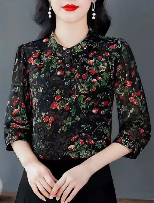 着るだけで気分が華やぐ、エレガントなローズプリントブラウス。 生地全体に散りばめられた繊細なラメが、光を反射してさりげなく煌めき、顔周りをパッと明るく見せてくれます。 まるで水彩画のような上品なローズプリントは、派手になりすぎず、大人の女性が取り入れやすいシックな配色です。