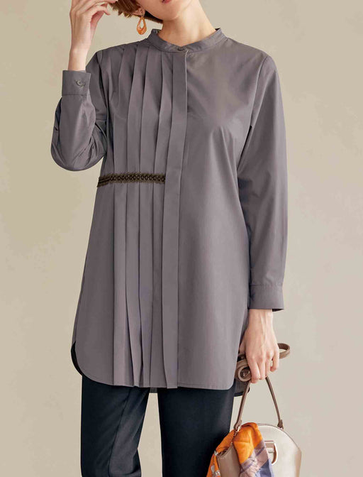 端正な縦ラインのプリーツチュニック。 右前身頃に施したプリーツが、縦長ラインを強調。 アクセントにあしらった繊細なレーステープはウエスト位置を高く、脚長に見せてくれます。 タック入りの袖口やラウンド裾のシルエットも美しい一枚。