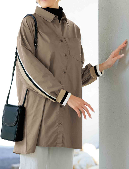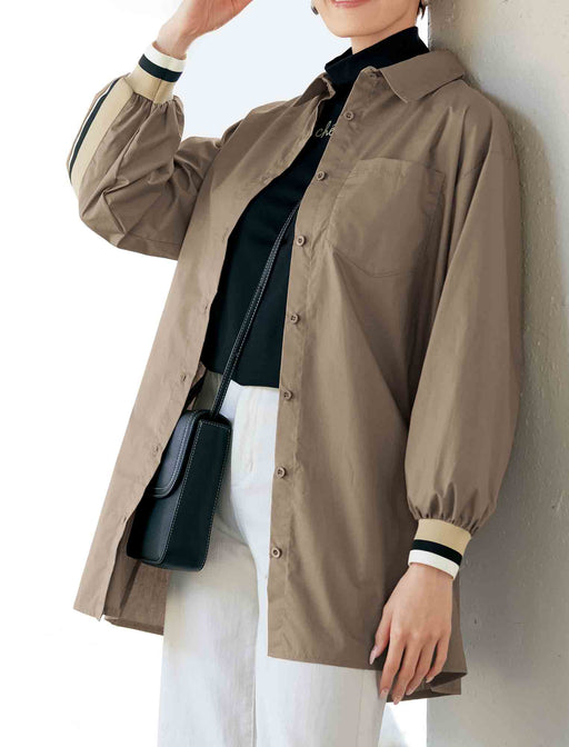 カラーラインがお洒落!大人なシャツチュニック。 後ろ身頃から袖口まで続くストレッチリブカットソーのカラーラインテープ使いがアクティブな印象。 適度なハリ感の生地は軽い羽織りとしてもスタイリッシュに着こなせます。