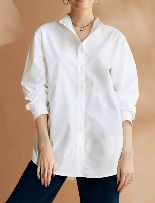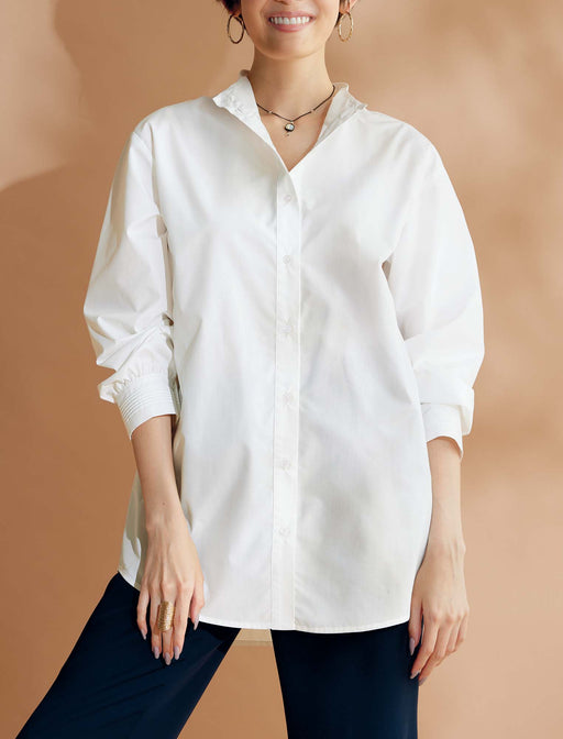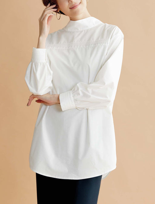 どっちもサマになる、雰囲気チェンジの2WAYシャツチュニック。 身頃と袖カフスのピンタックデザインが素敵。 ボタン側を前にして上部のボタンを外せば、自然な感じで襟を立てた着こなしが完成。 ボタンを後ろにすれば、キュートなピンタックチュニックに!