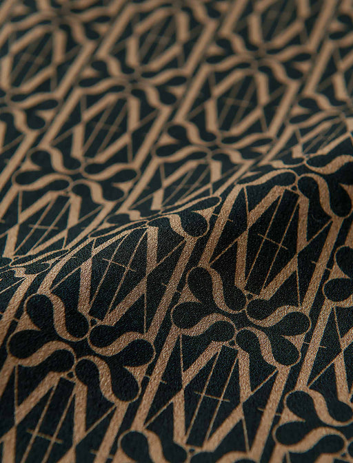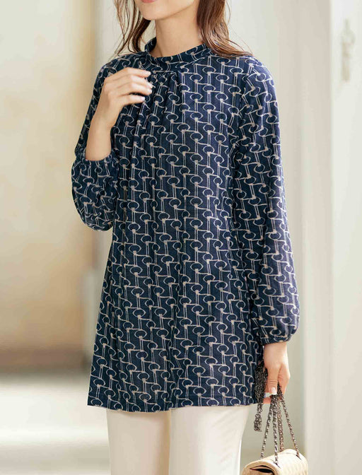 ジャカード&プリントのなめらかなハーモニー。 カットソージャカードの幾何学柄に、表情の異なるプリント柄を重ねた奥行きのあるデザイン。 胸元のギャザーから流れるような落ち感が美しく、ゆったりエレガントに体型をカバーしてくれます。