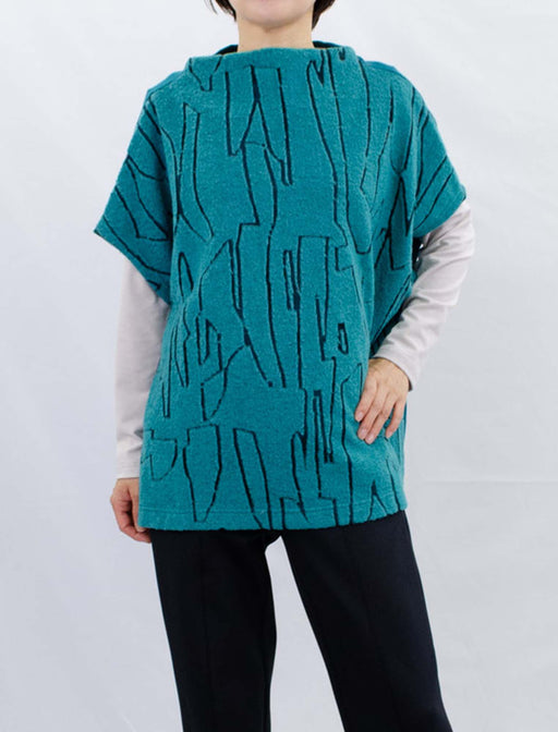 ゆったりと着られ肩先も暖かいニットベスト。 変化のある編み地とサイドスリットのボタンがアクセント。 タートルネックやシャツをレイヤードして大人カジュアルの完成。