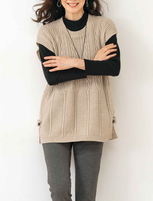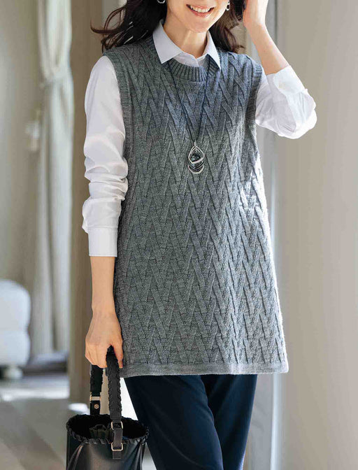 重ね着で始めるお洒落な秋。 カジュアルにもきれいめコーデにも着映えるチュニックベストは、立体感のある端正な編み柄が上品さを演出。 体型カバーも叶えます。